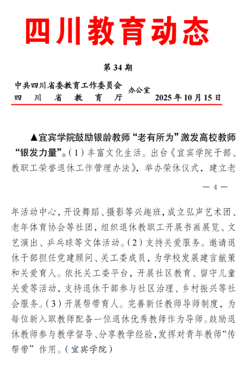 宜宾学院离退休工作被中共四川省委教育工作委员会、四川省教育厅《四川教育动态》34期报道