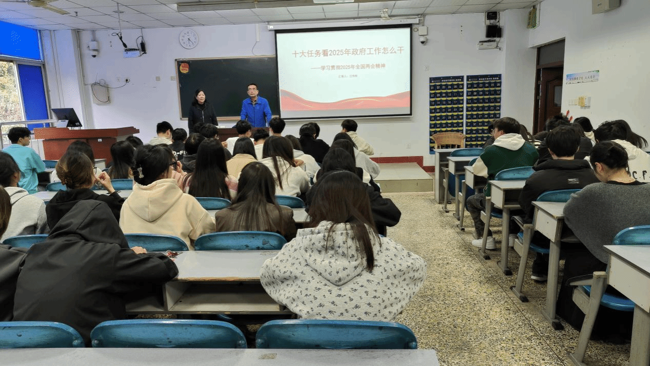 江传彬先带同学们回顾了政府在2024年所做的工作以及2024年闯过的难关,让同学们了解了我们国家在过去一年所取得的成就和目前所面临的挑战。紧接着向同学们介绍了2025年全国两会的热点问题,重点阐述了2025年政府工作的十大任务。同时结合自身丰富的实践经验,向同学们逐条阐释十大任务的重要意义,帮助同学们从学生的角度出发,结合自身特点,在2025年即提升自己也服务社会和国家。