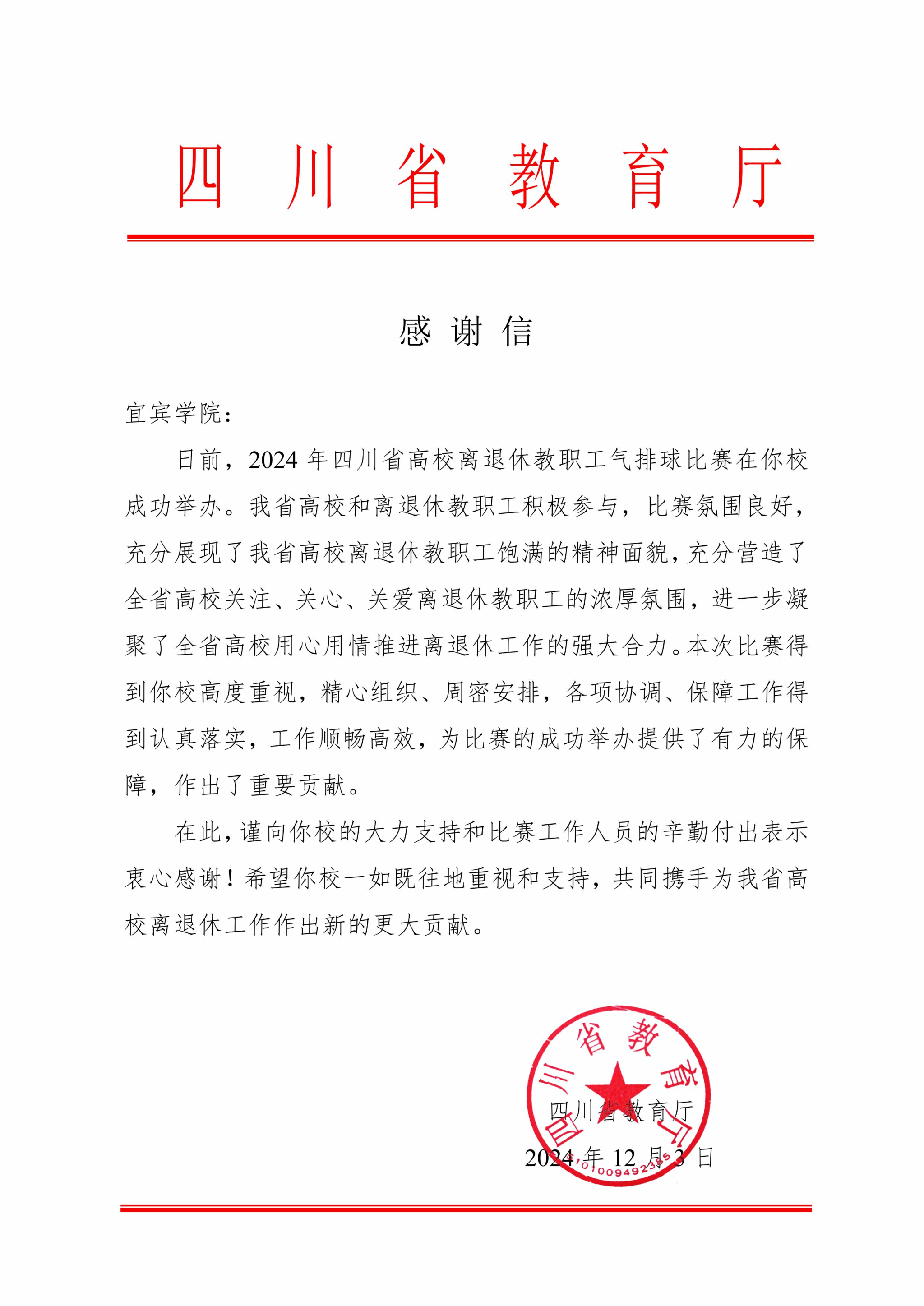 感谢信中指出,2024年四川省高校离退休教职工气排球比赛于2024年10月28日至30日在宜宾学院临港校区成功举办,四川省教育厅给予高度评价,各高校参赛运动员对比赛筹备工作给予充分肯定。自气排球比赛筹备工作启动以来,宜宾学院精心组织、周密部署,各项协调、保障工作得到认真落实,工作顺畅高效,为比赛的成功举办提供了有力的保障,作出了重要贡献。