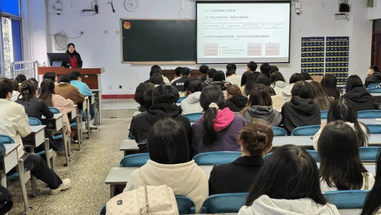 江传彬先带同学们回顾了政府在2024年所做的工作以及2024年闯过的难关,让同学们了解了我们国家在过去一年所取得的成就和目前所面临的挑战。紧接着向同学们介绍了2025年全国两会的热点问题,重点阐述了2025年政府工作的十大任务。同时结合自身丰富的实践经验,向同学们逐条阐释十大任务的重要意义,帮助同学们从学生的角度出发,结合自身特点,在2025年即提升自己也服务社会和国家。
