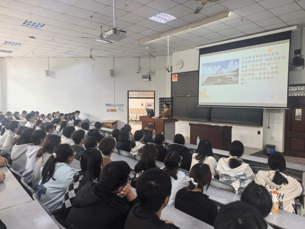 讲座还组织学习了中央八项规定精神及其最新实施细则相关内容,引导学生深刻理解全面从严治党的重要意义,增强纪律意识和规矩意识,从入学伊始就筑牢拒腐防变的思想防线,弘扬勤俭节约、务实奋斗的优良作风。在谈到学校就业工作时,江教授介绍:“学校聚焦应用型人才培养,与五粮液、宁德时代等知名企业共建产教融合平台,助力学生在实践中稳步成长。”她以“不等不靠、自己创造”的价值理念激励青年学子,鼓励他们努力成长为有理想、有信仰、有担当的时代新人。