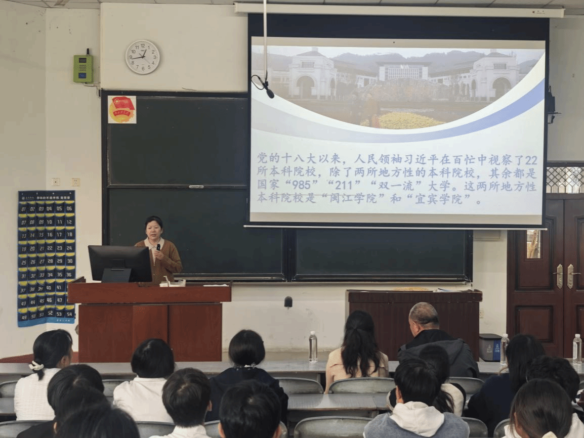 在《咱们的宜宾学院》校史讲述环节,江教授将学校发展历程比作一部与时代同行的奋斗史诗。她以“风起李庄—花香桥溪—放歌临港”三大里程碑为主线,系统梳理了学校的发展脉络:1978年,学校前身宜宾师范专科学校诞生于抗战时期的文化重镇李庄,赓续了厚重的精神血脉;2001年,三校合并升本,开启综合性大学建设新征程;2020年,临港新校区投入使用,成为习近平总书记亲临视察的重要一站。江教授通过深入挖掘校史资源,结合专题讲座与实地研学,引导学生传承艰苦奋斗精神,践行“崇德砺学、知行合一”的校风。